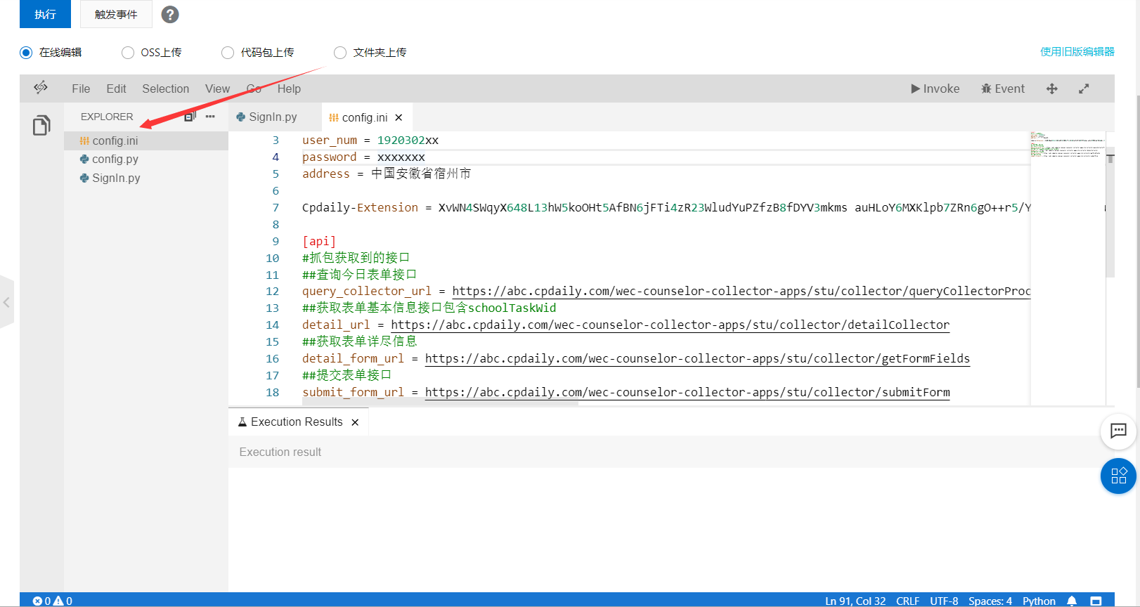 进入在线编辑后选择config.ini分别修改user_num password address为你的学号,密码和地址。