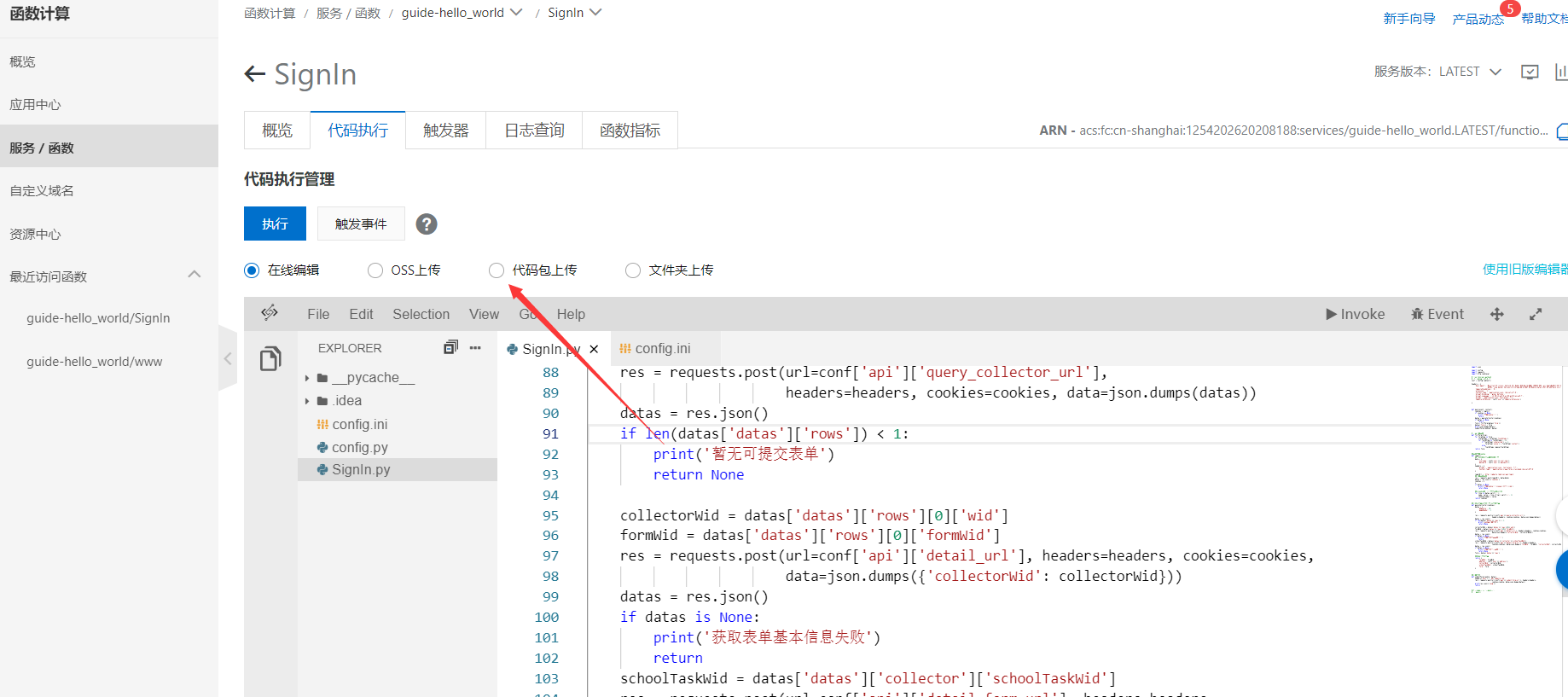 跳转后进入函数编辑状态,选择代码包上传 代码包链接