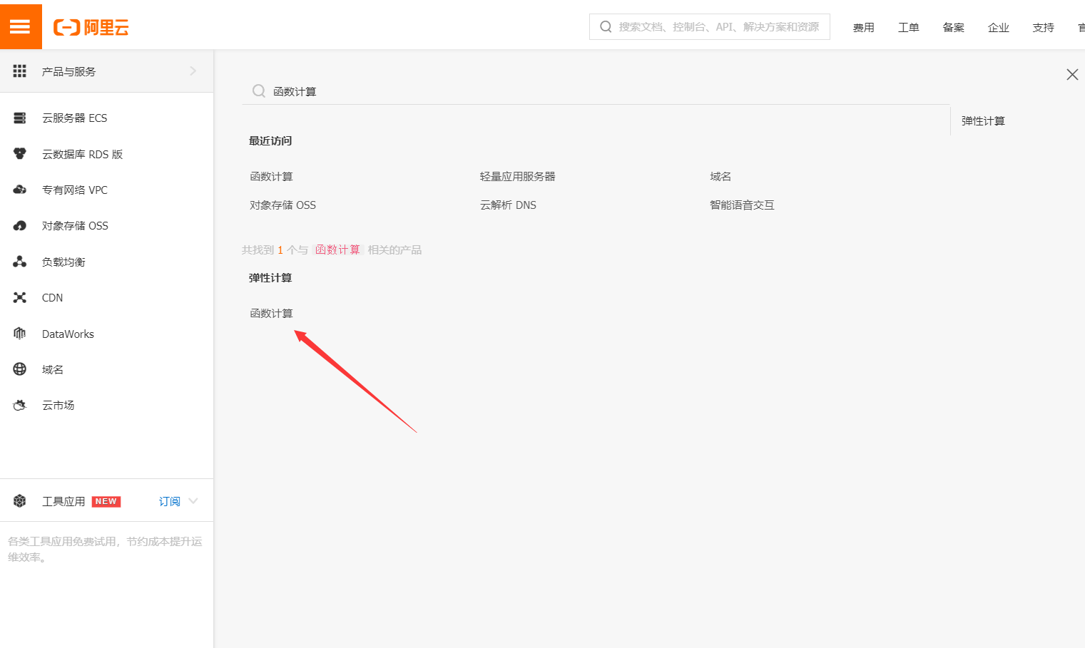 新手教程可以跳过,进入函数计算的控制台界面后点击: